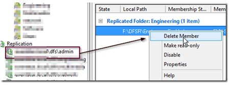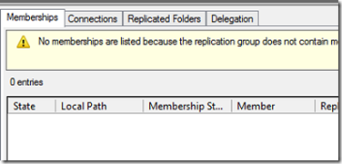 If there are multiple members that are not replicating, delete them all from the replication partnerships until there are no member servers in the namespace, as shown below.