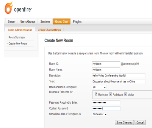 Security: If you leave this part blank, anonymous users can create a conference room.You don’t want the FBI knocking on your door because some criminal organization has been using your video server to communicate. For this reason, I recommend that you create a user name and password (both are case sensitive).