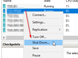 Log in to the Hyper-V host and gracefully shut down the VM